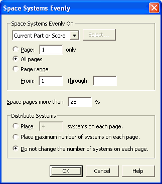The Space Systems Evenly command, which displays this dialog box, lets you specify which pages to space evenly, whether to allow systems to move from one page to another, and when to skip spacing a partially-empty page. Finale will move the systems so that they are evenly spaced between the top and bottom margins of the page.