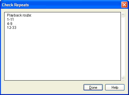 This option scans the entire score for repeat markings and lists the chronological sequence of measures as they will be performed when you playback the score.