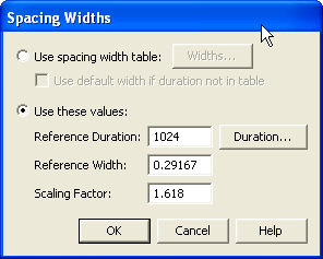 In this dialog box, enter width durations and scaling for music spacing, either using a Width Table or entering specific values.