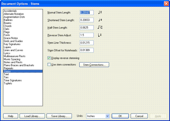 Document Options-Stems dialog box