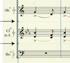 Select a region of staves (or from the Edit menu, choose Select All), and then choose this option to hide all empty staves in the region. Hidden staves are displayed as dashed blue lines as shown below. See Hiding empty staves.