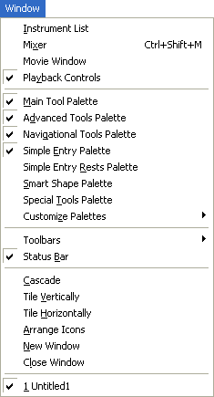 The Window menu controls (and indicates) which windows are open, and which are in front (active). It also has Tile and Cascade commands, which automatically and neatly arrange multiple open windows into a more convenient layout.