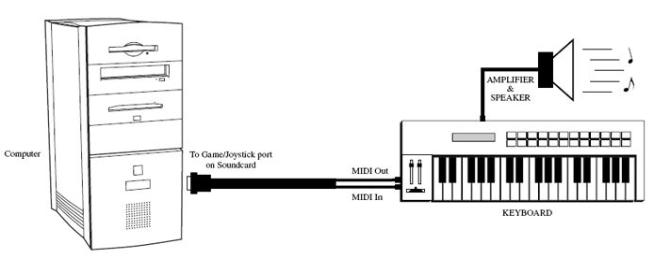 We will assume that your computer is equipped with a sound card, which is designed to also act as a MIDI interface and has the appropriate driver software installed. If you are using a dedicated MIDI interface, you will need to consult its documentation for instructions on setting up your MIDI system. At the very least, in addition to the sound card you will need the following equipment for an operational MIDI system (not including your computer):
