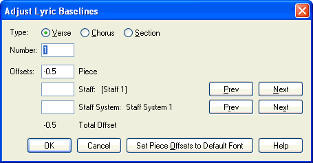 You’ll usually want the baseline of Verse 1, for example, to be just below the melody, and Verse 2 to be just under Verse 1. As a matter of fact, Finale’s default values position verses in precisely that way: one beneath another. If you change the font for your Verses (by choosing Select Default Fonts from the Document menu) and find you have overlapping lyric due to the font size, you can neatly adjust the baselines for all lyric lines at once by clicking the Set Piece Offsets to Default Font button.