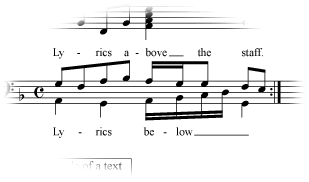 There are two ways to add lyrics to your score in Finale. You can type the lyrics directly into the score, so that you know at all times where you are in the music—a feature called Type Into Score. Or you may prefer the Click Assignment method—where you type the lyrics in Finale’s text processor (called the Lyrics window), and then paste them into the score. Regardless of the method you use, the Lyrics window is available for ease in entry and editing.