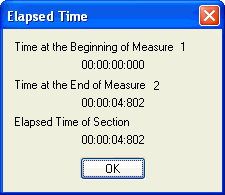 This dialog box gives the following information: (1) the amount of time that has passed from the beginning of the piece to the beginning of the selected region; (2) the time that has passed from the beginning of the piece to the end of the selected region; and (3) the total time of the selected region itself (all in thousandths of a second).