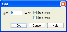 The Add dialog box’s contents change to reflect your MIDI data type selection (key velocities, note durations, or MIDI continuous data such as controllers and wheels). Its function is to add a fixed amount to (or subtract a fixed amount from) the duration of every note in the selected region. Because it adds an absolute amount to every selected note, the Add command preserves the relative proportions of the existing values.