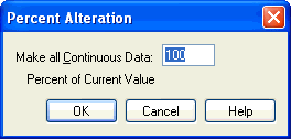 This dialog box’s function is to change the continuous data value of every note in the selected region by a percentage of its current value. Because it changes the data of every selected note by a percentage, the Percent Alter command preserves the relative proportions of the existing values.