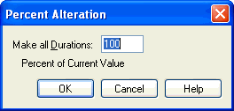 This dialog box’s function is to change the duration of every note in the selected region by a percentage of its current value. Because it changes the data of every selected note by a percentage, the Percent Alter command preserves the relative proportions of the existing values.