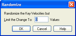 In this dialog box, you can direct Finale to alter the velocity for all selected notes at random. This can be a useful option if you want to give your playback a more imperfect, "human" feeling. (The Randomize command isn’t available if you’ve selected Continuous Data from the MIDI Tool menu.)
