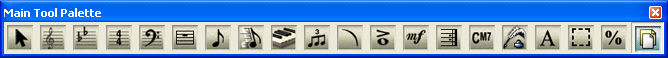 This palette contains all of Finale’s primary tools, which you can rearrange or hide. You can move, resize, reshape, or hide the palette itself. You hold the mouse over any of the tools to find out what the name of the tool is. Click on the name of the Tool in the picture below to view that section of the manual.