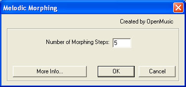 Notes: The plug-in examines the melodies in a 2-D space, where y-axis is pitch, and x-axis is time. Curves are stretched so the first point and the last point of each curve have the same x-coordinate. Then the first curve is continuously warped through a number of steps (entered as Number of Morphing Steps in the dialog box) until it matches the second curve.