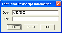 If you want to embed the date and another single line of identifying text into the code of your PostScript listing (as a reference), use this dialog box to enter the information. The information you type here doesn’t print out; in fact, you’ll only see this information if you open the PostScript listing with a word processor, where the information will appear in the header at the beginning of the listing.