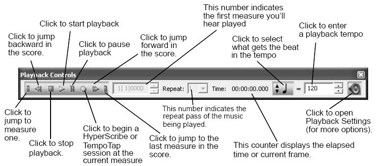 Playback Controls reside on a movable/dockable window. They give you several additional controls over the way your score plays back—for example, they contain Play, Stop, Rewind, and Fast Forward buttons. They also let you listen to any portion of the score, even if you’re viewing a different section on the screen.