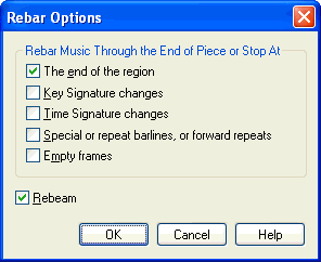 Note: If you didn’t select any of the checkboxes, Finale will rebar your score all the way to the end of the piece whenever it’s asked to rebar (when you change the time signature, insert a partial measure, use the Rebar command, and so on).