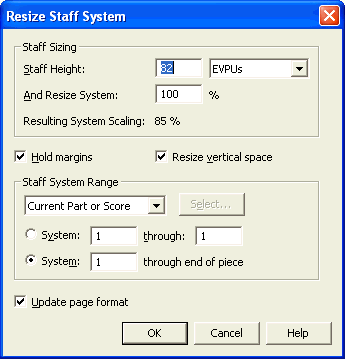 Sizing: Staff Height • Units • And Resize System • Resulting System Scaling.