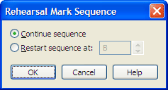 Use the Rehearsal Mark Sequence dialog box to specify the new number or letter to use when restarting a rehearsal mark sequence.