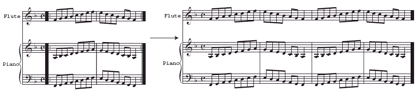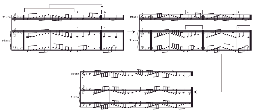If repeats are already defined in a score for playback, you can easily convert the file to a through composed format by exporting it as a MIDI file, and then importing the generated MIDI file back into Finale. Repeated sections are then written out sequentially. Since all playback data is saved with MIDI files, information relevant to SmartMusic accompaniment creation is not lost in this conversion. See MIDI files for details. If you do this, ensure the solo staff is assigned to a different channel than the accompaniment staff(ves) in the Instrument List window.