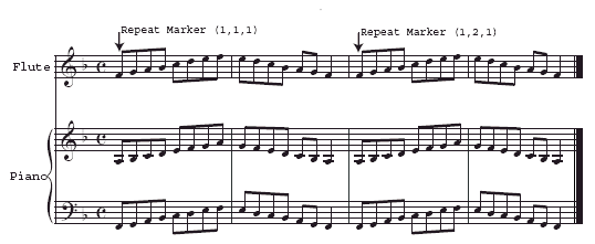You have completed defining a basic repeat for transfer to SmartMusic. Now, follow the instructions under SmartMusic to create the accompaniment SMP file. To create markers for repeats containing multiple endings, see To add markers for Ending repeats. To create markers for DS or DC repeats, see To add markers for D.S. and D.C. repeats.