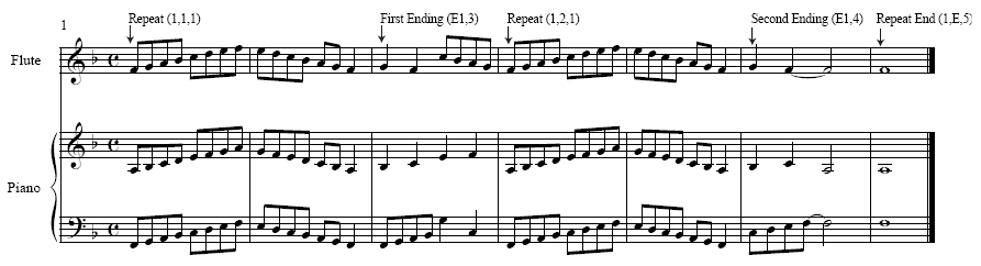 A repeat with a first and second ending properly defined for export as a SmartMusic accompaniment. The repeat and ending expressions are defined as Repeat markers and the final expression in the last measure is defined as a Repeat End marker. The values in parentheses are those that would appear in the Description text box of the Expression Designer.