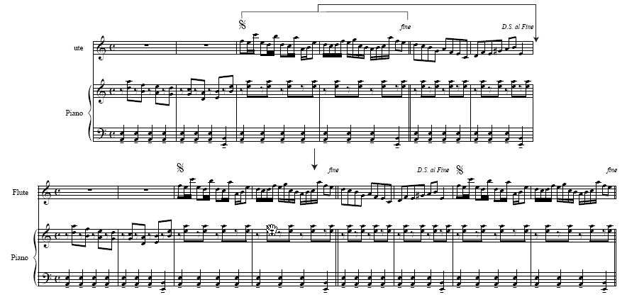 The image below shows an example of a D.S. repeat with the appropriate SmartMusic Performance Markers. The values in parentheses are those that should appear in the Description text box of the Expression designer.