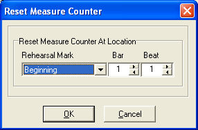 From the Utilities menu, choose Add SmartMusic Markers. Select Reset Meas. Counter from the marker list on the left and click Add. Or, select an existing Reset Measure marker from the Marker window and click Edit.