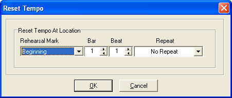 Use the settings in this dialog box to control the measure assignment for the Reset Tempo marker you are adding or editing. The Reset Tempo marker eliminates slowing/speeding effects due to the intelligent accompaniment.