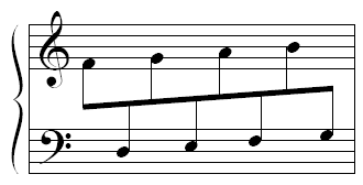 A reverse stem is one that’s drawn on the wrong side of its notehead; it’s encountered most frequently in conjunction with cross-staff notes, like this: