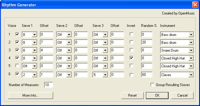 As an example, if you choose 2 for a Sieve value and enter 2 for the Sieve Offset, then the first sixteenth note will appear on the third pulse. In the first measure this would yield notes on pulses 3, 5, 7, 9, 11, 13, and 15.