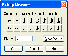 Use this dialog box if the first measure of your score is a pickup measure; Finale will automatically add blank "count-off beats" before the pickup itself and adjust the measure numbers. You can enter an EDU value yourself (1024 per quarter note); a simpler route is to click on the palette of note values. Click the value of the pickup and click OK. Finale fills in the text box for you. When you return to the score, Finale will have created invisible "rests" at the beginning of the measure for a duration long enough to fill the measure and still leave room for the pickup value you specified. Any notes you now enter will appear after these invisible rests. This method is only effective if the pickup measure is the first measure of the document.
