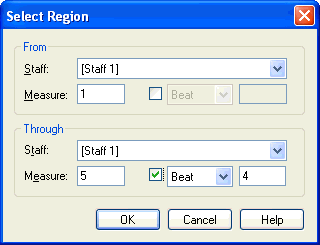 If you select any measures before you choose Select Region from the Edit menu, Finale identifies the first selected measure’s number and staff name in these boxes automatically. That’s useful to remember if the first measure of the desired region is visible on the screen—then, when you arrive at this dialog box, you only have to specify the ending measure of the region (see below), which saves you several steps.