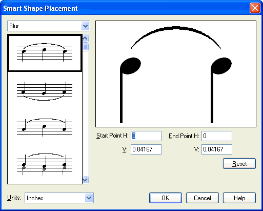 Finale makes intelligent decisions about a slur or bend’s direction and end position based on the stem positions of notes, as well as conditions of voicing and beaming. The slurs in the list box represent the rules that Finale automatically follows.