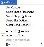 The Smart Shape menu gives you control over the appearance and placement of slurs and smart shape lines, as well as control over how elements will appear in the score. Use the commands in this menu to tell Finale whether slurs are note-attached or attached to measures. Most of the commands are used to fine-tune slurs' appearance and placement, define their behavior over system breaks, and set their line thickness. When you create a note-attached slur, Finale always draws and places it the way you specified in the slur settings. For a detailed description of how to manipulate each smart shape element see Slur Contour dialog box, Smart Shape Placement dialog box, Smart Shape Options dialog box, Smart Slur Options dialog box, and Guitar Bend Options dialog box.