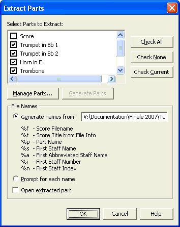 This dialog box allows you to extract parts into individual documents. When you do this, each new file Finale creates is identical to the corresponding part from the parent document.