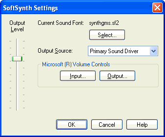 Here, select the software synthesizer you want to use for output and adjust the volume controls and output level. Changes in this dialog box apply to standard playback as well as audio files created using the Export to Audio File feature under the File menu.