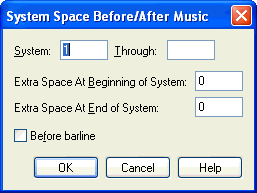 Use this dialog box to specify additional space and the beginning or end of a staff system or region of systems. Enter values in the unit of measurement specified in the Measurement Units submenu of the Edit menu.