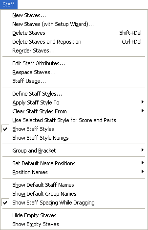 Use the Staff menu to add or insert blank staves, remove existing staves, position staff names, change the settings for a selected staff, adjust staves vertically, redraw barlines and brackets after changing the top-to-bottom order of staves, and set the spacing between staves. You can also create groups and define their characteristics, delete groups, choose a bracket and alternate barlines for a group, and change which staves belong to a group.