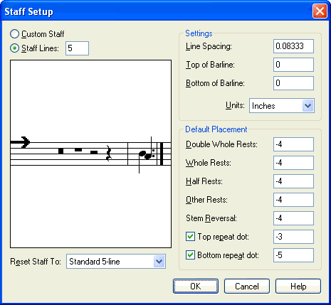 Staff to: • Standard 5-line • 1-line with Full Barline • 1-line with Short