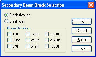 The Secondary Beam Break Tool lets you create breaks in the inner beams of sixteenth notes and smaller values. (To break eighth note beams, click the measure with the Speedy Entry Tool (or choose the Simple Entry Tool), click the note after the desired beam break, and press the slash key [/].) In this dialog box, you can specify which beams you want to break.