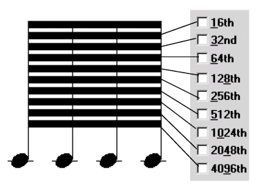 Note: Some of these duration values are smaller than you can enter with the Speedy Entry Tool (the 4096th note, for example). You can create such a note by setting the duration manually in the Edit Frame dialog box or through the Change Note Durations command in the Utilities menu. See Edit Frame dialog box or Change Note Durations dialog box..