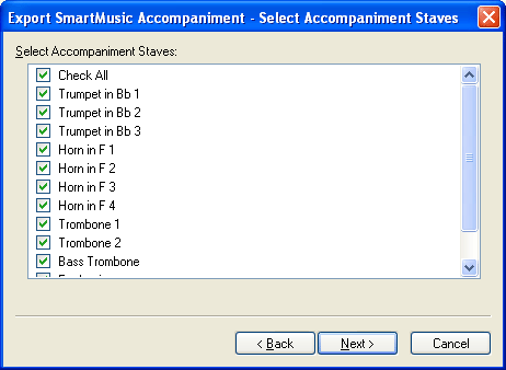 The steps in this section explain how to create an ensemble file for use with SmartMusic. Ensemble files are not capable of utilizing SmartMusic’s Intelligent Accompaniment feature. However, you will be able to mute instruments from playback during the SmartMusic Performance. For example, a trombone player might mute the piano and drums in a big band chart in order to better hear how his part fits with the other horns. (Note that you can also save a single-staff exercise as an assessable SmartMusic accompaniment. To create an exercise, see Exercise Wizard.)