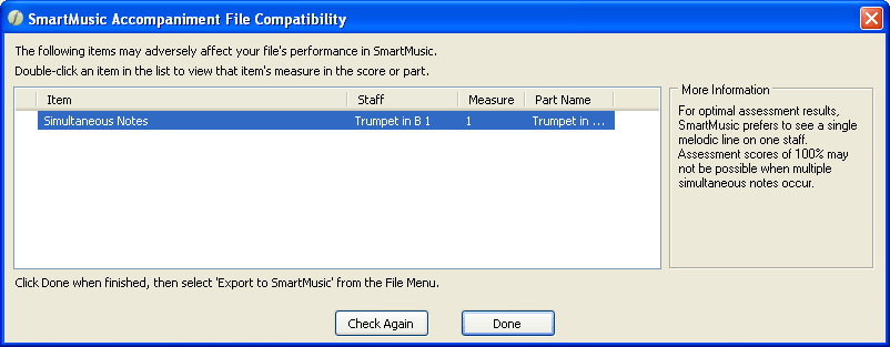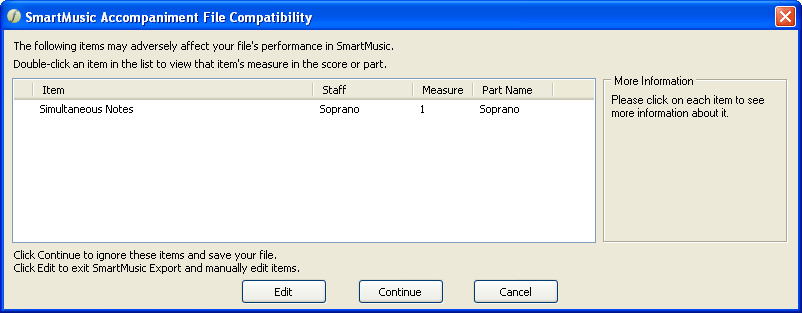 Some aspects of notation that can be created in Finale are not fully compatible with SmartMusic. Some of these detract from assessment accuracy, others cause problems with navigation in SmartMusic, others are not supported by SmartMusic altogether. If, while exporting a SmartMusic accompaniment, your file includes any item not fully compatible with SmartMusic, this dialog box appears identifying the conflicts.