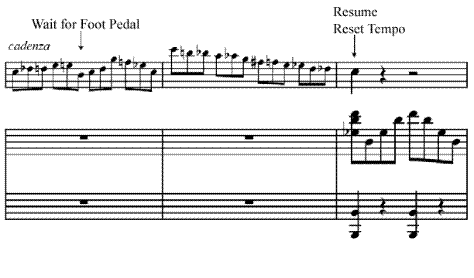 Cadenzas are unaccompanied passages performed by the soloist. You can use a Foot Pedal marker inserted during the cadenza, and then a Resume marker after the cadenza to ensure the accompaniment resumes in coordination with the soloist (upon receiving a foot pedal message).