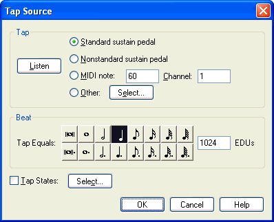 In this dialog box, you tell Finale what key, pedal, or controller you’ll be tapping to provide a tempo reference as you play.