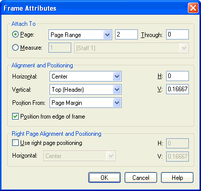 For measure-assigned text blocks, use the Frame Attributes dialog box to specify the staff and measure to which Finale should assign the text block; for page-assigned text blocks, specify which pages a text block will appear on, and position the text block vertically and horizontally on the page. The dialog box appears with the settings already selected for measure- or page-assigned text blocks.