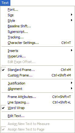 The Text menu appears when the Text Tool is selected for editing text blocks directly on-screen, or when the Edit Text window appears for editing staff and group names. An abbreviated text menu is also available in the Lyrics window, Edit Staff Name, and Text Expression Designer dialog boxes.