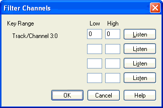 In the Filter Channels dialog box, you specify the ranges of the notes from each of up to four tracks you want Finale to transcribe onto a single staff. Note, however, that the Filter function has no meaning if you haven’t specified at least one track by entering its number in one of the text boxes at the top of the Track/Channel Mapping dialog box. If you click Filter without having specified a track, Finale will display an alert message.