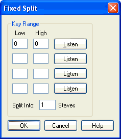 Note: You don’t have to calculate the key numbers and type them in manually. Click the Listen button (see below) beside each pair of text boxes, and play each note—the lowest, then the highest note in the range; Finale enters their key numbers in the text boxes automatically. You can split the notes of the track (or tracks) you’ve indicated into as many as four separate staves this way. These staves will appear in the same top-to-bottom order as these pairs of text boxes.