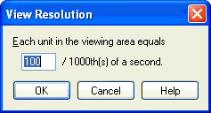 The View Resolution also determines the initial duration of any new note you create by double-clicking in the keyboard display area (the bottom three-quarters of the display window). Its default duration is 15 units, where a unit is equal to the number in this text box. In other words, if the View Resolution is 100 (thousandths of a second—that is, one-tenth of a second), the note produced by a double-click is 1500 thousandths of a second long, which is 1.5 seconds. See Transcription window for further details on editing notes and Time Tags.