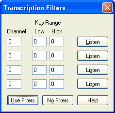 In this dialog box, you can specify certain MIDI channels and ranges of notes you want to include or exclude from the transcription. You could, for example, specify that only the notes within a certain octave range to be transcribed, even though your performance included notes all over the keyboard.